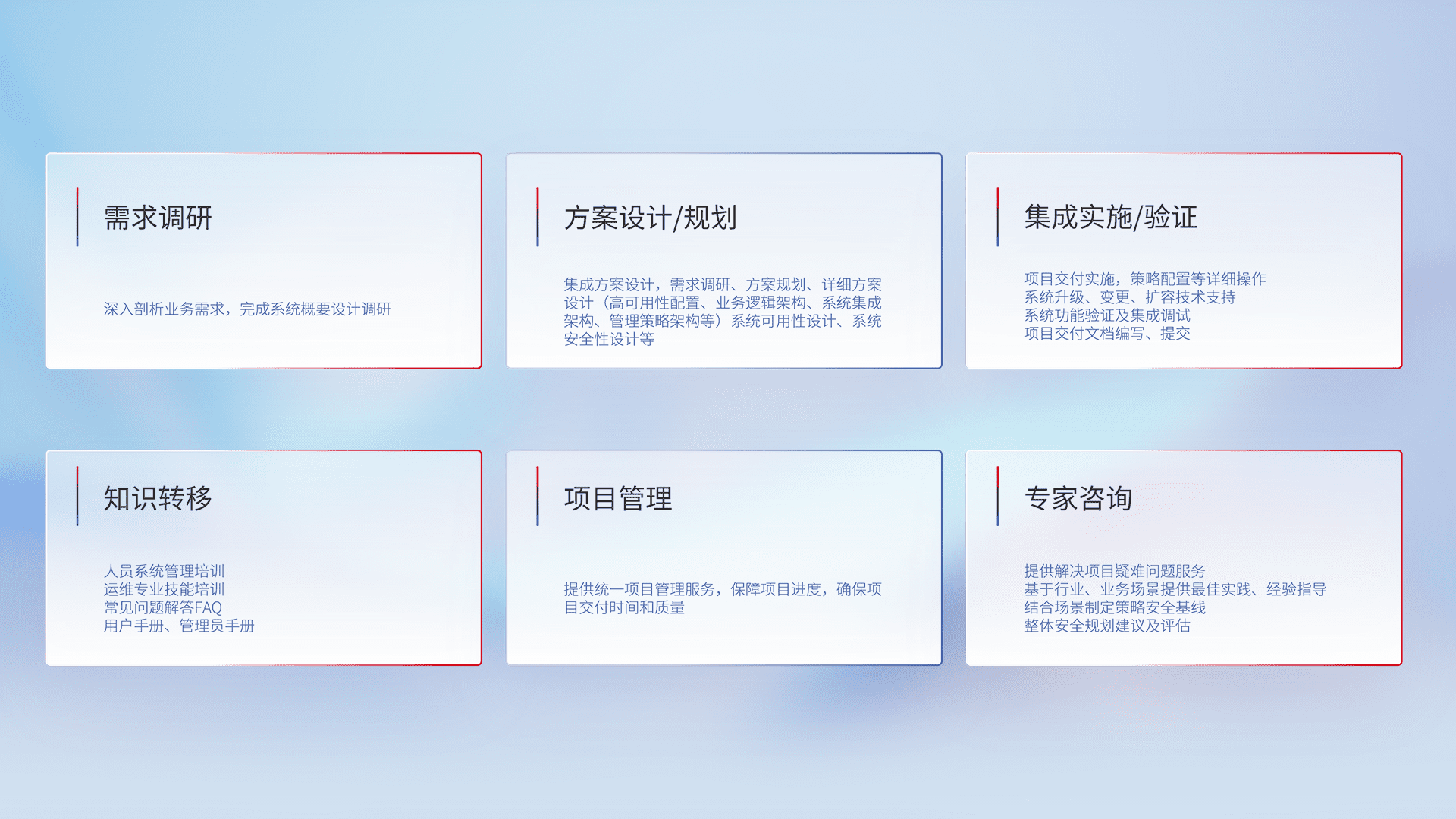 针对客户行业特性,,将宏观的安全战略和需求,,通过专业的交付服务,,实现项目落地,,,,为客户提供标准规范的集成交付服务。。。